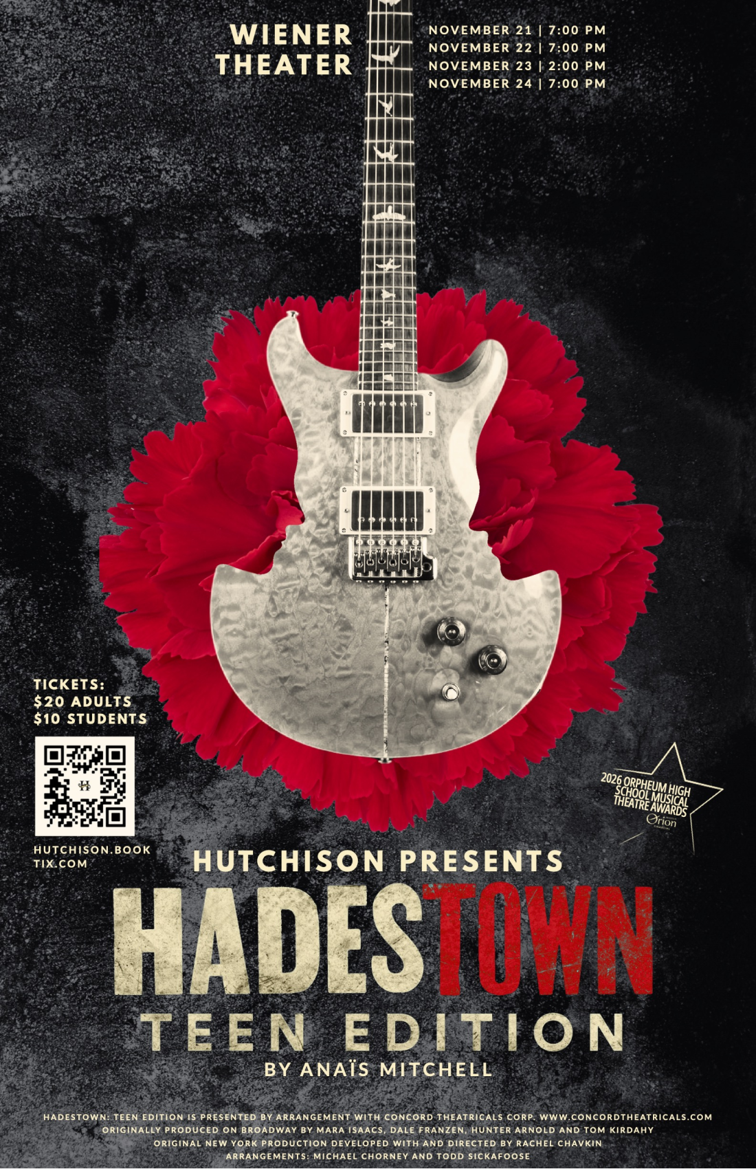 Hutchison presents Hadestown: Teen Edition with Hutchison students in grades 7-12 and boys grades 9-12. Hadestown: Teen Edition is an adaptation of Anaïs Mitchell's acclaimed folk opera, reimagining the Greek myth of Orpheus and Eurydice. It follows the young lovers, Orpheus and Eurydice, and also features the intertwined love story of Hades and Persephone. The story explores themes of love, hope, sacrifice, and resilience set against a backdrop of American folk music and vintage New Orleans jazz.